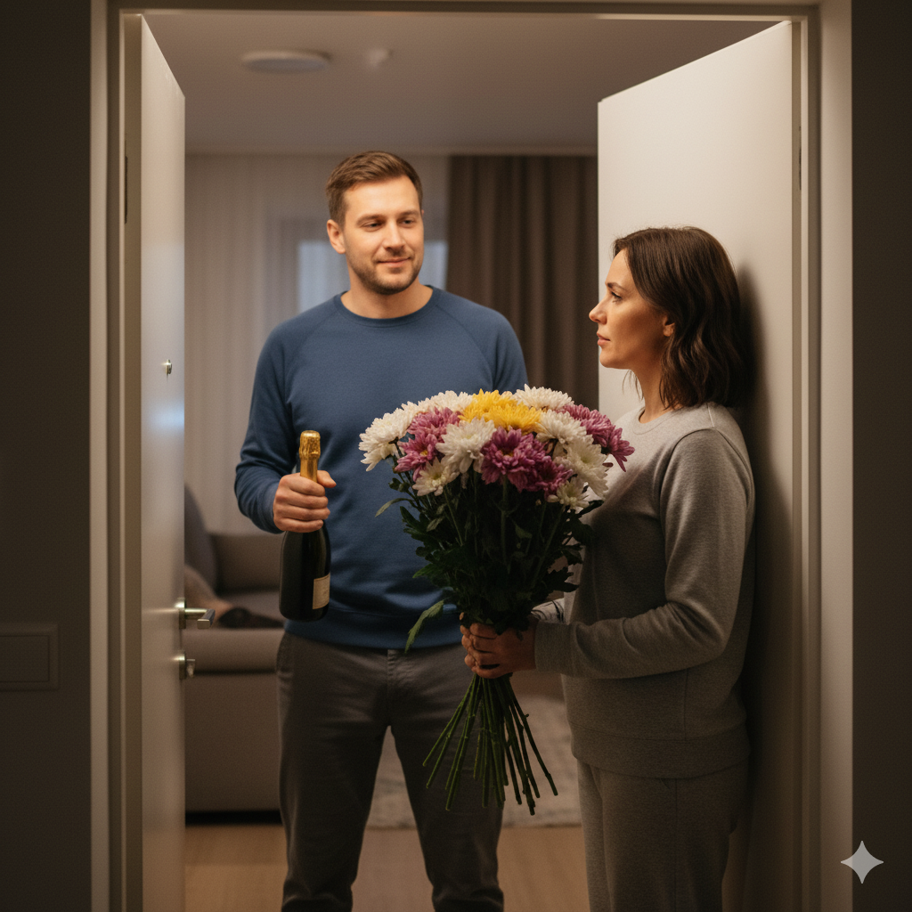 ​В руках Максим держал шикарный букет хризантем и бутылку шампанского.​