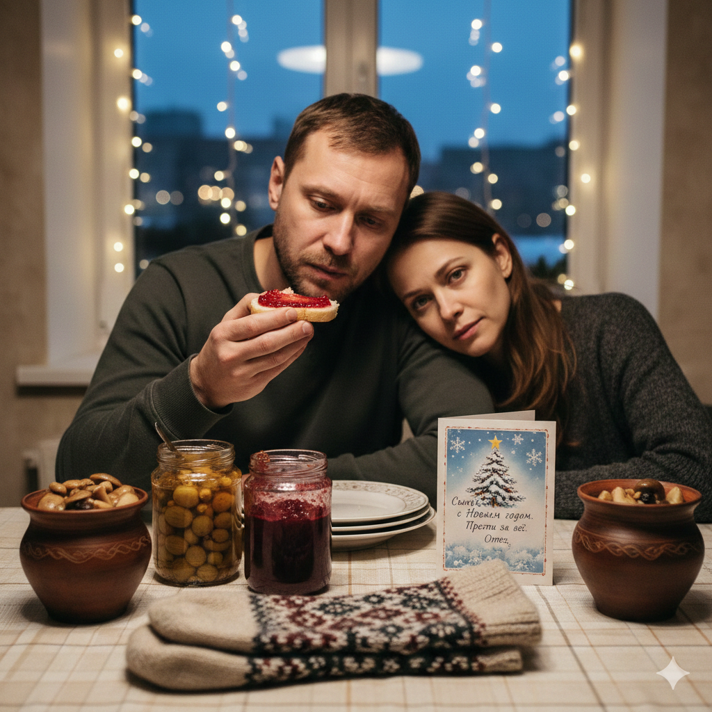 Посылка пришла за неделю до Нового года. Три банки варенья — малиновое, вишнёвое, крыжовниковое. Две банки солёных грибов. Шерстяные носки, которые связала мать Алексея. И открытка — простая, с ёлкой и снежинками. Внутри кривым почерком: «Сынок, с Новым годом. Прости за всё. Отец».