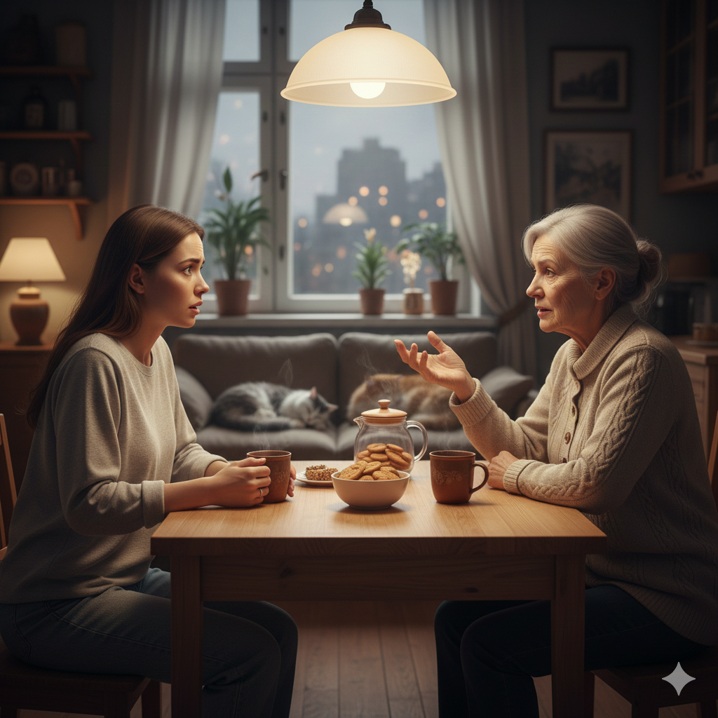 Алла, в замешательстве, бросила взгляд на Ольгу Семеновну. Та шустро поднялась и засеменила в подъезд. Она же, чувствуя себя предательницей, но сгорая от любопытства, поплелась за соседкой. Квартира соседки была уютной, на диване спали два кота. Они расположились на кухне, женщина поставила чайник на плиту, достала печенье.
