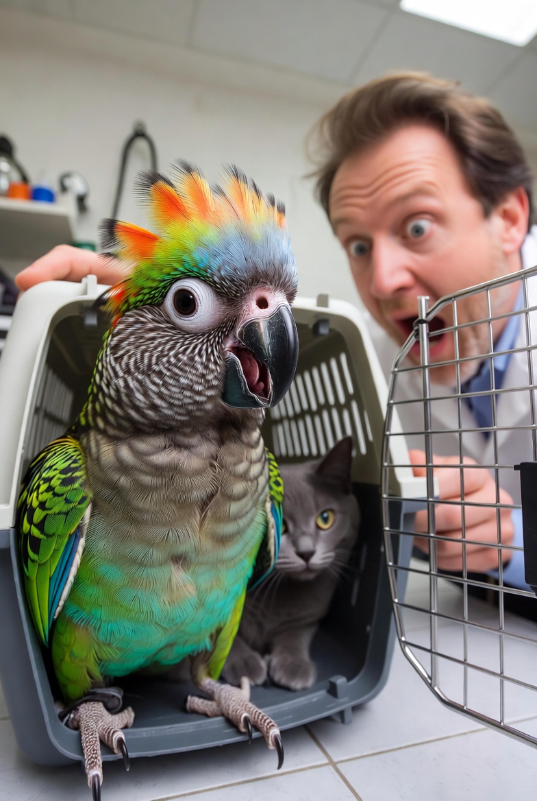 Врач не заметил спрятавшегося за попугаем кота. Жуткий Жук сидел, гордо подняв хохолок и раскрыв клюв. Он защищал своего ненавистного врага, не давая нам достать его из переноски.