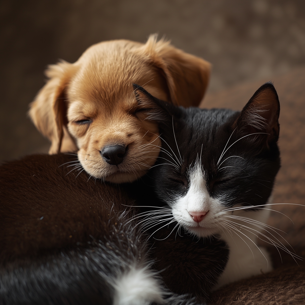 Котёнок и щенок сидели, прижавшись друг к другу.