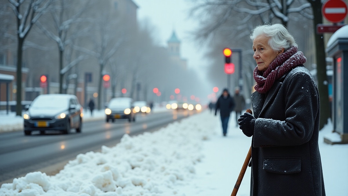 Снегопад усиливался, дороги становились скользкими, машины двигались медленно, а пешеходы, кутаясь в шарфы, спешили по своим делам. Впереди, у автобусной остановки, Алексей заметил пожилую женщину. Она стояла, слегка покачиваясь, глубоко втянув голову в воротник пальто, а в руках сжимала палку. Вокруг неё уже намело небольшой сугроб, и по тому, как она выглядела, было понятно — она ждёт давно.