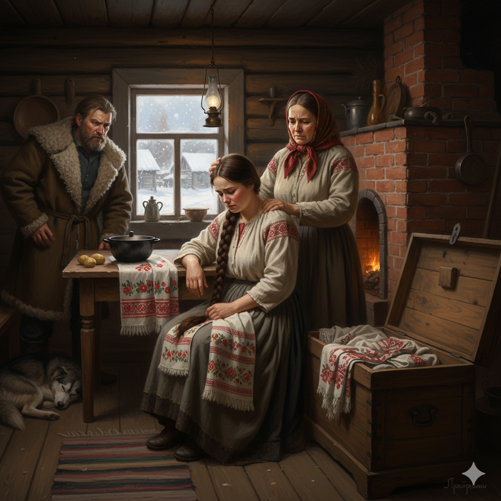 Митрофан ввалился в избу, как медведь, немного разрумянившийся с морозца, тулупчик скинул, бородой тряхнул, взглянул на жену и на дочку, брови нахмурил, сразу понял: снова плачутся.