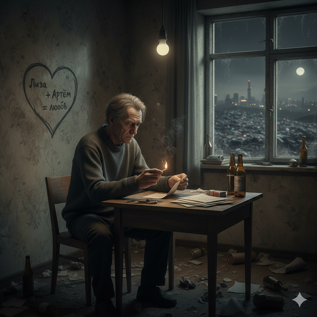 Он чиркнул спичкой, глядя, как огонь пожирает лист. На стене, под слоем пыли, виднелась надпись: «Лиза + Артём = любовь».