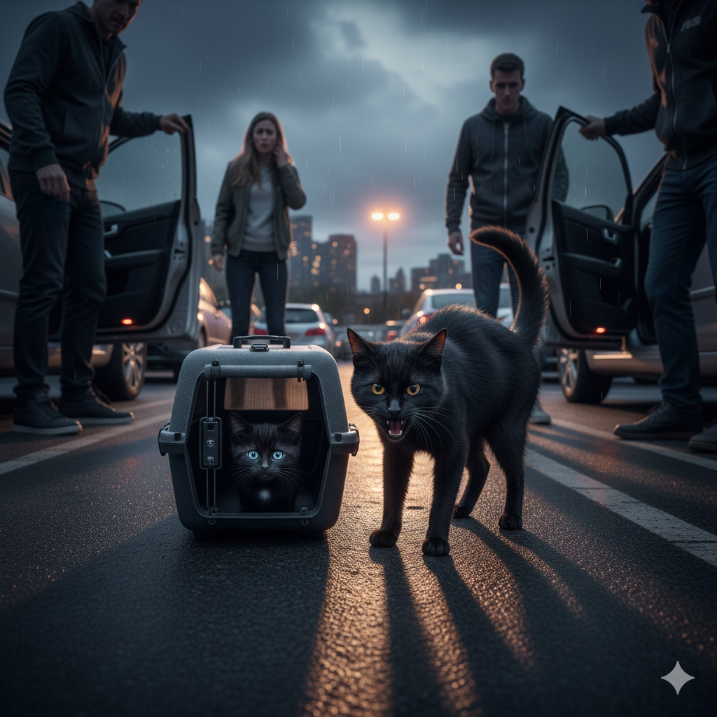 Она бросалась на этих людей, стараясь отогнать их от переноски, в которой сидел её чёрный котёнок.