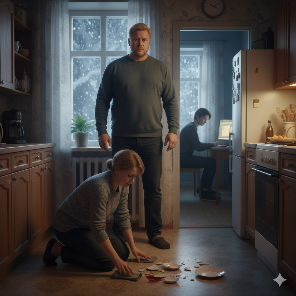 — Мам, ты что, плачешь? И что это за осколки? — Артём подошёл ближе, заметил кровь на ноге у матери. — Мать, ты ранилась! Папа, ты что сидишь? Помоги же!