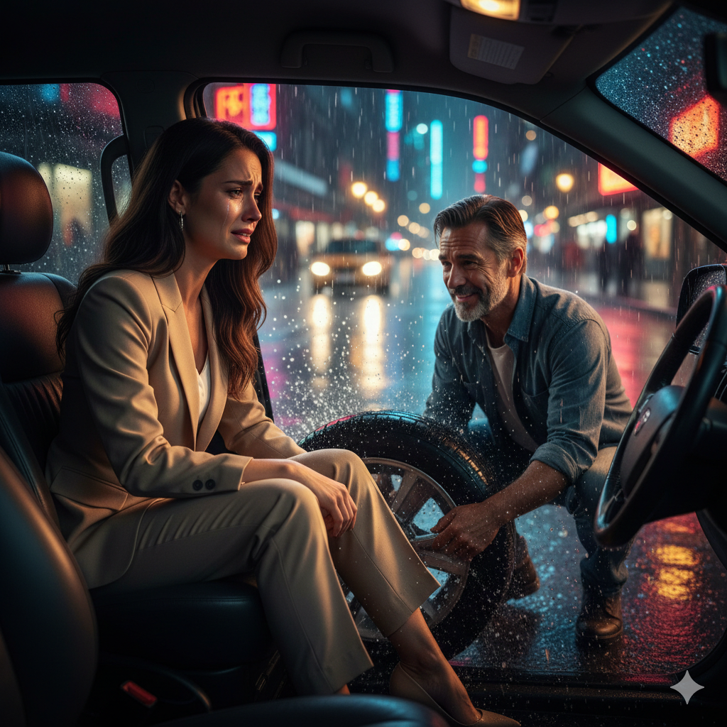 Даша кивнула. От радости, что он готов ей помочь, она чуть не расплакалась. Мужчина достал запасное колесо, принёс из своей машины инструменты и принялся за работу.