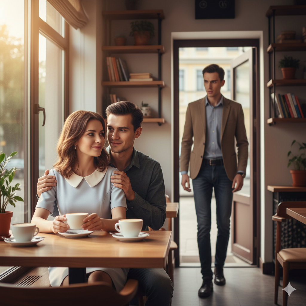 Агата сидела, наслаждаясь латте с карамельным сиропом, когда вдруг почувствовала, как её сердце пропустило удар. В дверях кафе появился Костя. Он явно не ожидал увидеть её здесь, особенно с кем-то.
