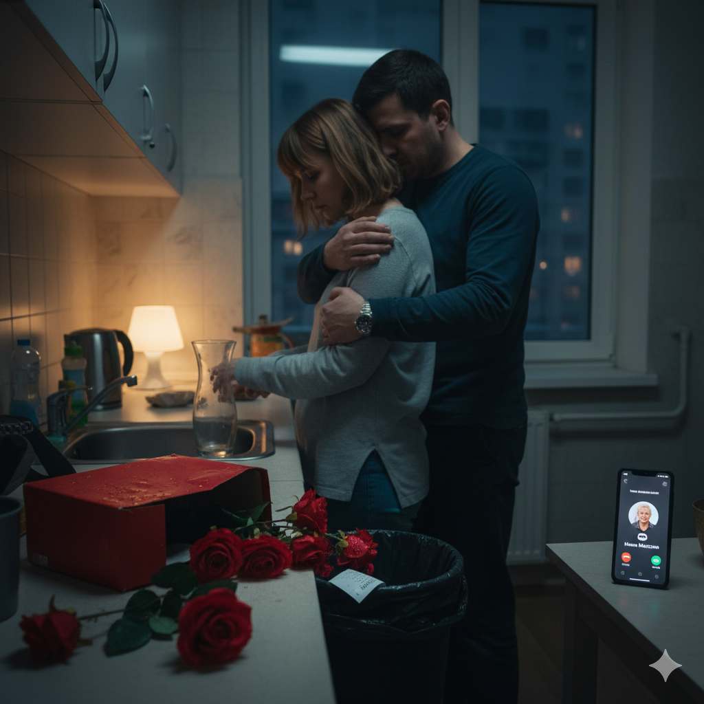 Запах подгоревшего ужина смешался со сладким ароматом роз. Я стояла у плиты, а Максим застыл на пороге кухни. Он только что вошел, снимая мокрый от снега ботинок, и его взгляд уперся в огромный алый букет, гордо возвышающийся на обеденном столе в прозрачной вазе. На лице мужа застыло странное выражение — не гнев, а скорее усталая горечь.
