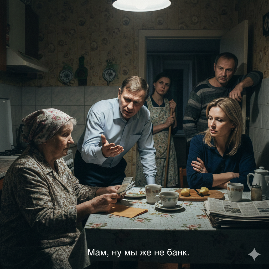 — Когда я им деньги давала, я не спрашивала твоего разрешения, — сказала она наконец. — Просто давала. Потому что они мои дети, и я хотела им помочь. А когда мне нужна была помощь, мой сын пошёл спрашивать разрешения у жены.