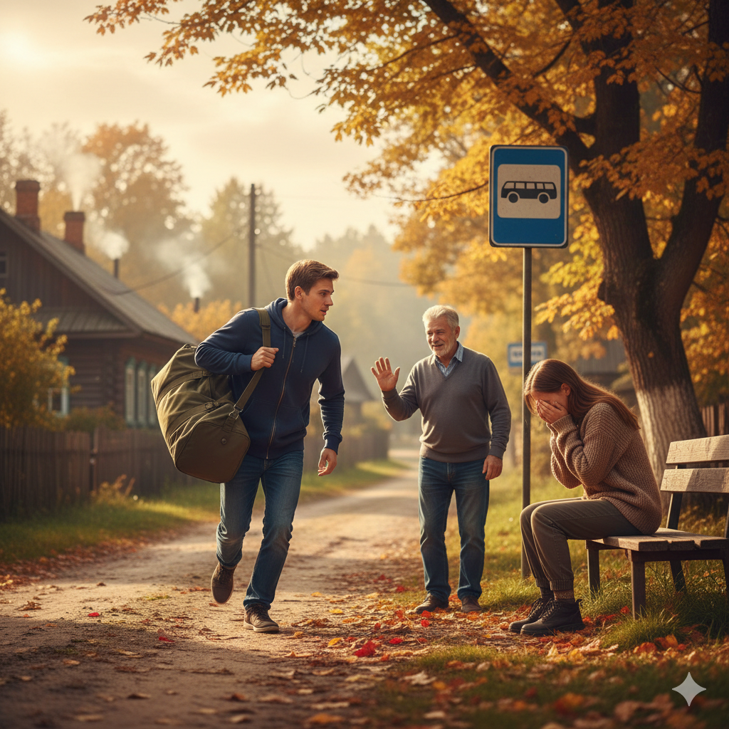 Тёплое октябрьское утро в деревне. Василий вышел из дома с большой дорожной сумкой. Обернулся у калитки и помахал рукой. По дороге к остановке здоровается с соседом.