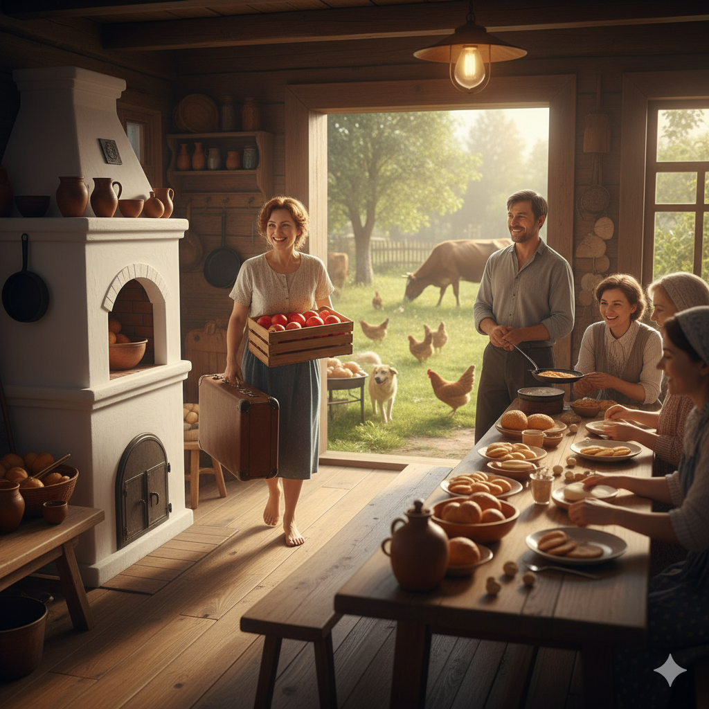 После такой сложной голодовки, в которую отправил ее председатель колхоза, она легко выпрыгнула из рейсового автобуса, таща за собой чемодан с вещами и целый короб ароматных южных яблок. Она легко подняла весь этот груз и неслась к родному дому в ожидании хорошей сытной еды. Толкнув калитку ногой, она вбежала в дом и, наскоро обняв мужа, кинулась к печи.