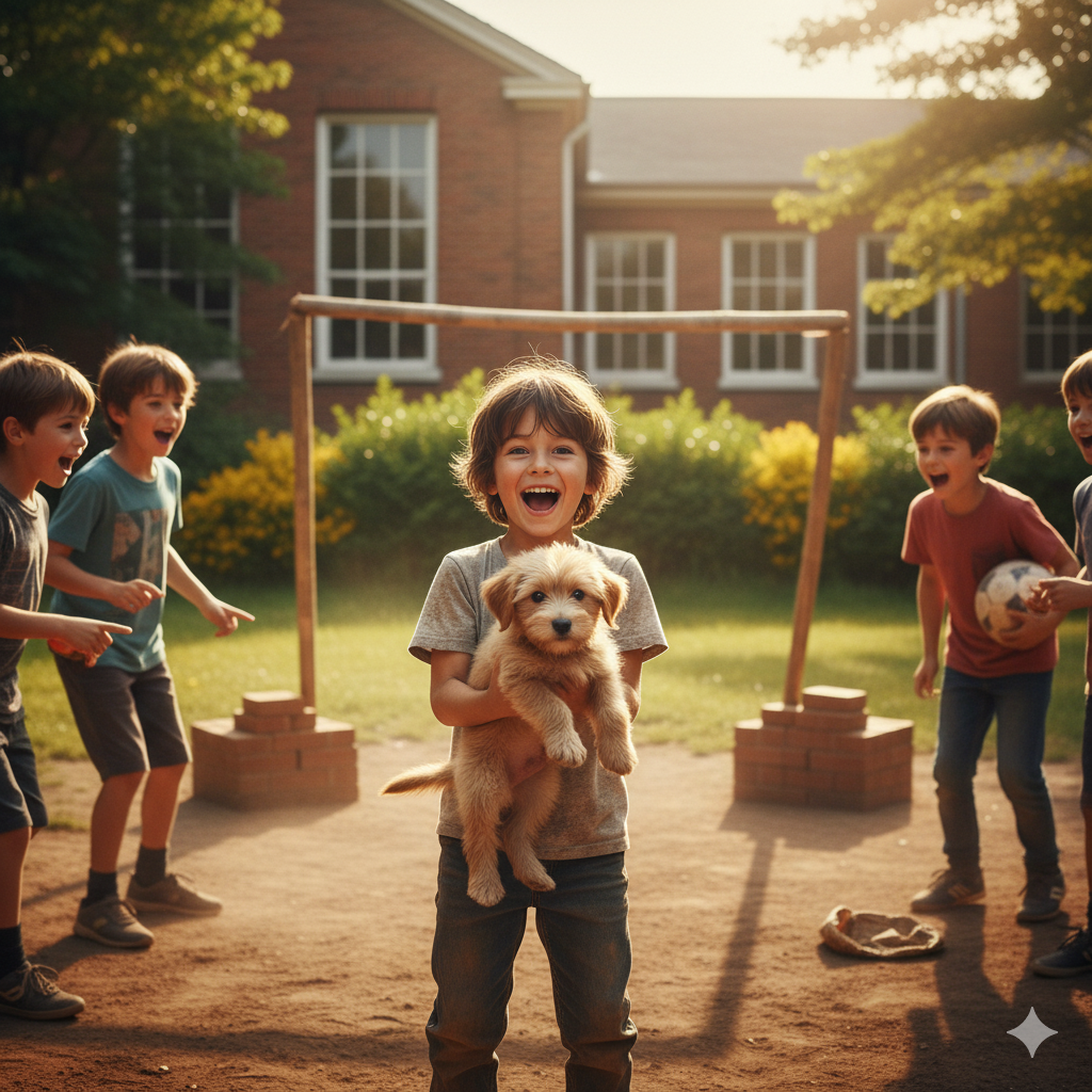 Мальчик наклонился и взял щенка на руки. Тот лизнул мальчика в нос, и еще, и еще раз. Яшка засмеялся и побежал домой, крепко обнимая нового друга…