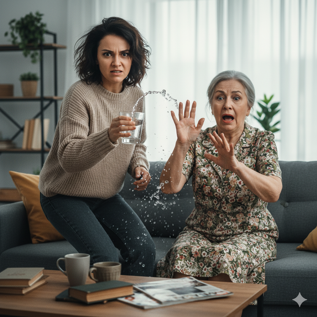 И в этот момент Лариса плеснула в лицо свекрови воду из стакана, который стоял перед ней на журнальном столике.
