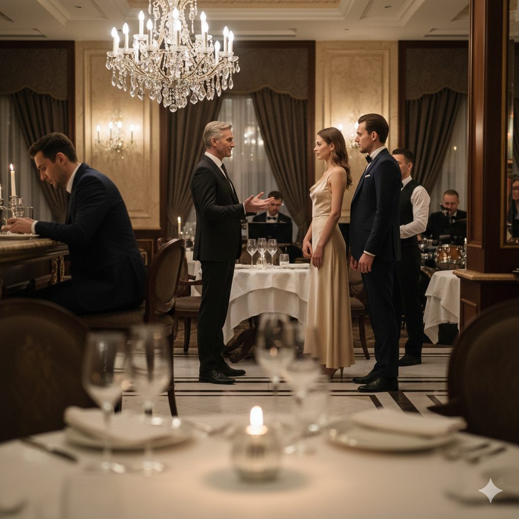Как только Софья переступила порог ресторана, Влад услышал, как каблуки уверенно простучали по мраморному полу, и она, как всегда, вошла так, будто освещала собой весь зал. На ней было элегантное платье цвета тёплого шампанского, а в ушах — маленькие алмазные звёздочки, переливавшиеся при каждом движении.