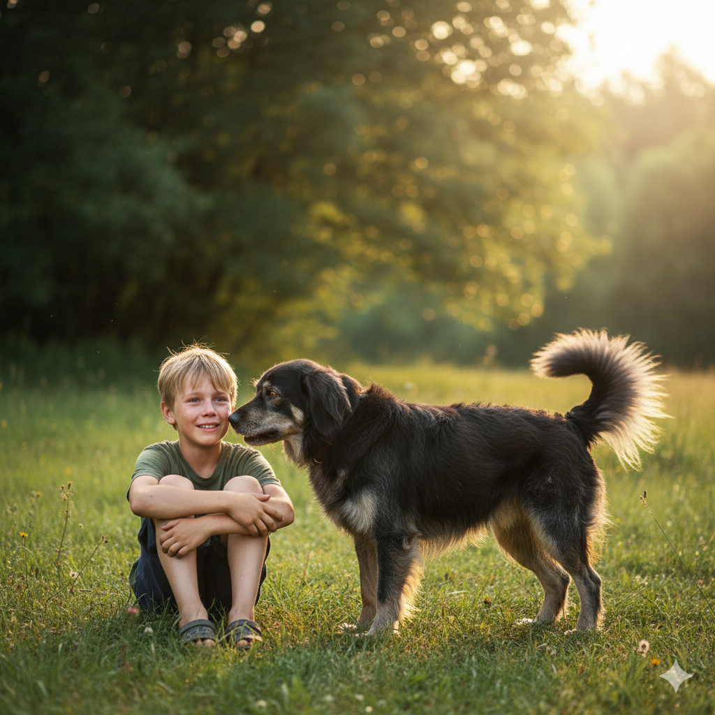 У Лохмача была густая чёрно-серая шерсть, а его глаза были очень умными и не по-собачьи серьёзными. Петьке даже показалось, что пёс понимает его.
