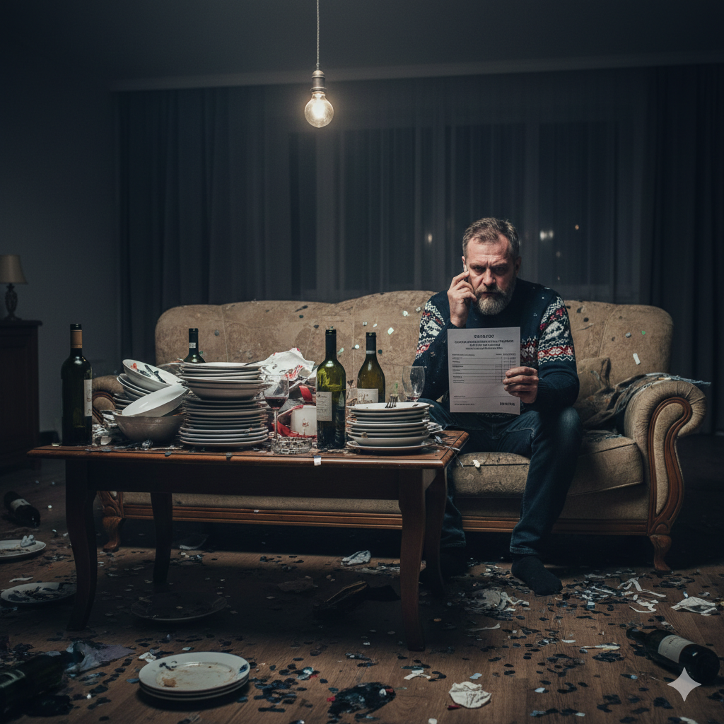 Девятого января гости разъехались. Дом напоминал поле битвы: горы грязного белья, пятна на коврах, переполненные мусорные вёдра, пустые бутылки повсюду.