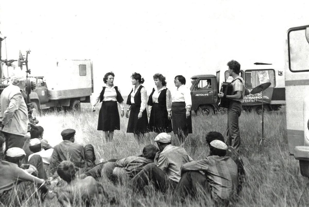 -Ты знаешь чего, а давай агитбригаду устроим, а? Я видел, в Пути Ильича, у них там по полям ездят, песни поют, боевой дух комбайнёров подымают, так сказать, а? Гриш.