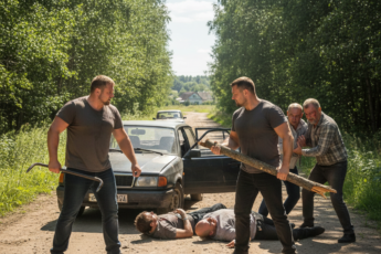 Артём удивился, увидев незнакомый автомобиль, подъехавший к дому соседа Григория. Из него вышли двое мужчин.