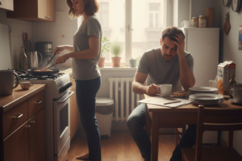 Конец августа. Небольшая квартира на окраине города. Кухня. Жена у плиты готовит завтрак. Иван входит