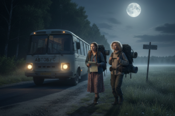 Ночная летняя дорога из города в село. Старенький пыльный автобус везёт сонных пассажиров. За окнами