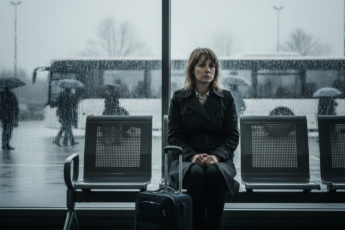 Хмурое дождливое утро на автовокзале. Александра купила билет и отошла от кассы в зал ожидания.