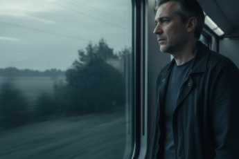 Ранее майское утро. В тамбуре скорого поезда курит мужчина. Седые виски и хмурый, уставший взгляд делают