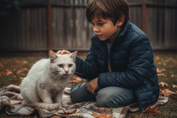 Мальчик направился к кошке, присел рядом и погладил её. Кошка беззвучно плакала. Она не просила, не мяукала