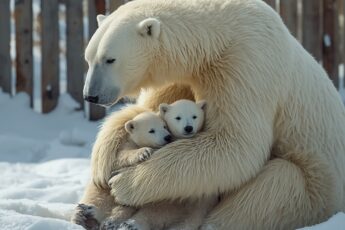 Небольшая белая медведица прикрывала собой двух маленьких медвежат. Она была худая и, судя по всему