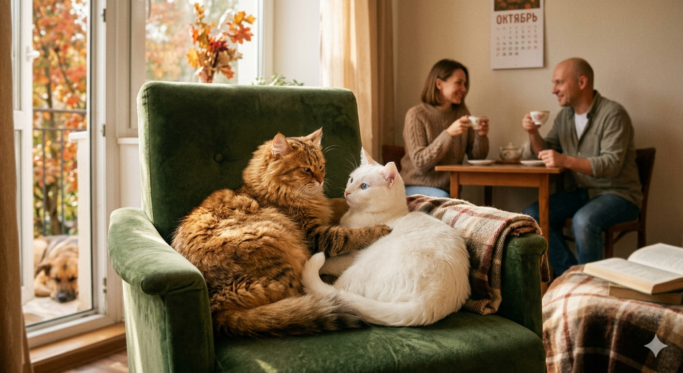 Пока наши хозяева пьют чай в гостиной (и как в них только помещается столько чая?), мы бегаем с Симочкой по саду, и сухие листья взрываются под нашими лапами, как маленькие салюты.