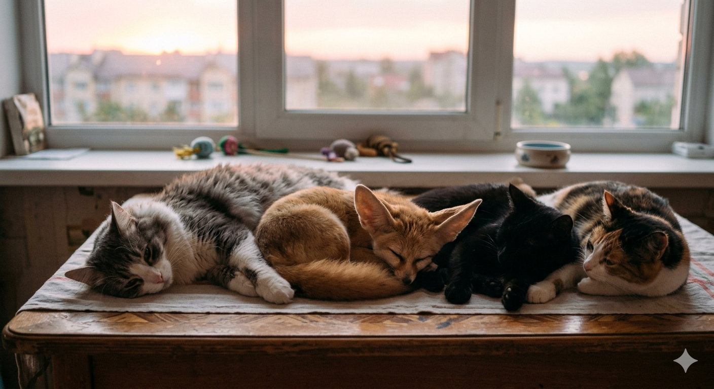 Активная лисичка умудрялась справляться с тремя драчливыми кошачьими дамами.