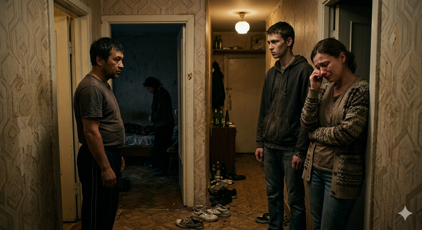 В этот момент из комнаты донесся звон разбитой бутылки и грубый хохот. Ринат что-то уронил на пол, и разлитое пиво потекло по линолеуму в коридор.