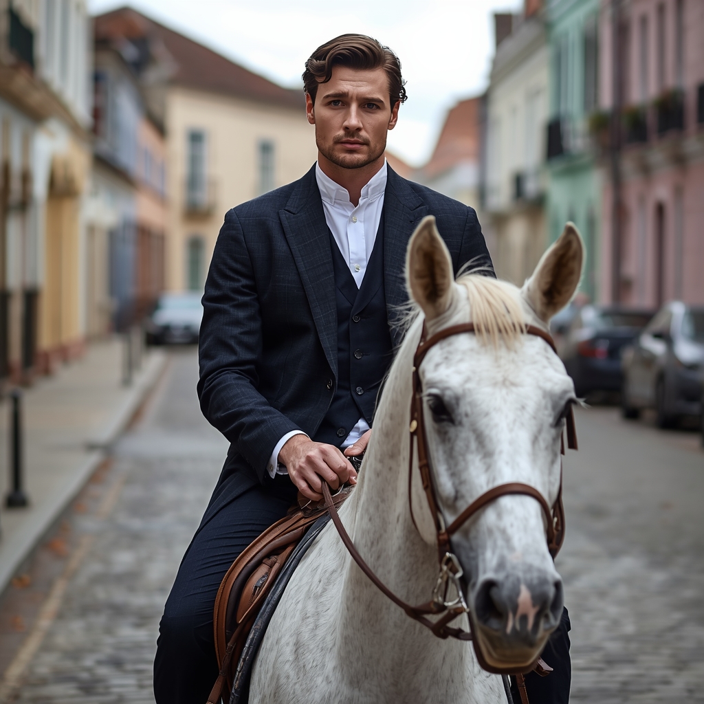 И вдруг они увидели его. Денис ехал на белом коне с букетом цветов. Пешеходы останавливались, машины сигналили, конь испуганно всхрапывал.