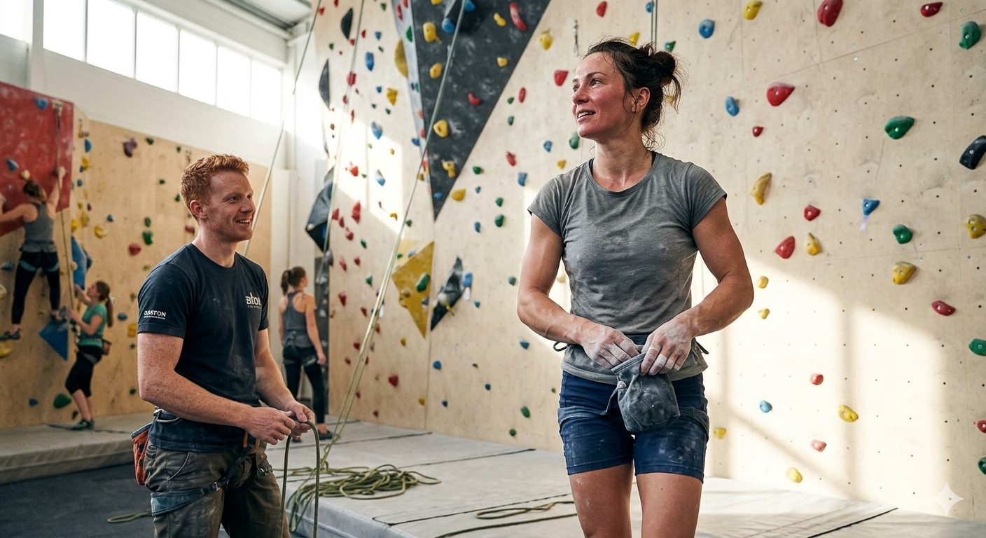 Первое занятие было унизительным. Люда не могла подтянуться даже на самую простую трассу, зацепы были скользкими, пальцы не слушались, она повисла в метре от пола и не могла ни подняться, ни спрыгнуть, потому что было страшно. Инструктор, рыжий парень с серьгой в ухе, страховал её и говорил: