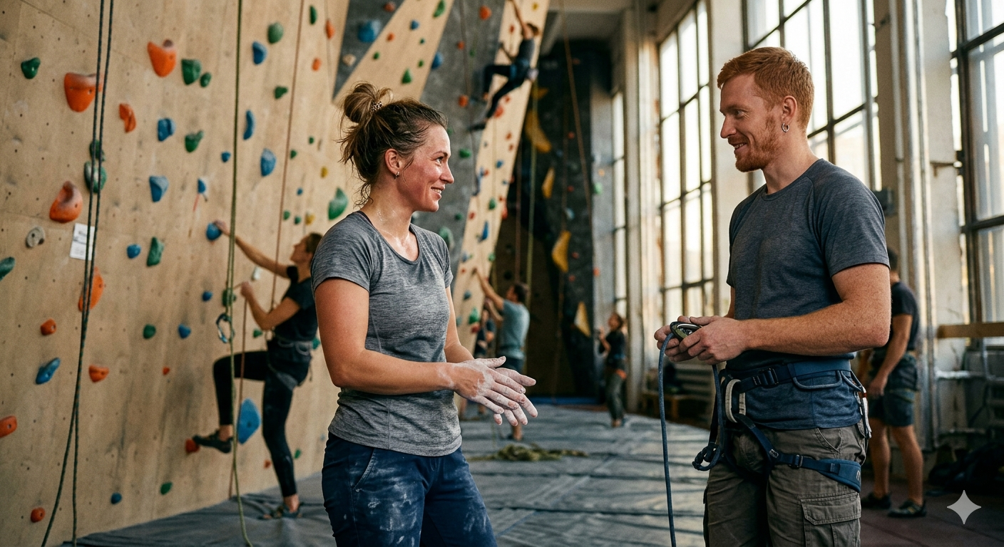 Первое занятие было унизительным. Люда не могла подтянуться даже на самую простую трассу, зацепы были скользкими, пальцы не слушались, она повисла в метре от пола и не могла ни подняться, ни спрыгнуть, потому что было страшно. Инструктор, рыжий парень с серьгой в ухе, страховал её и говорил: