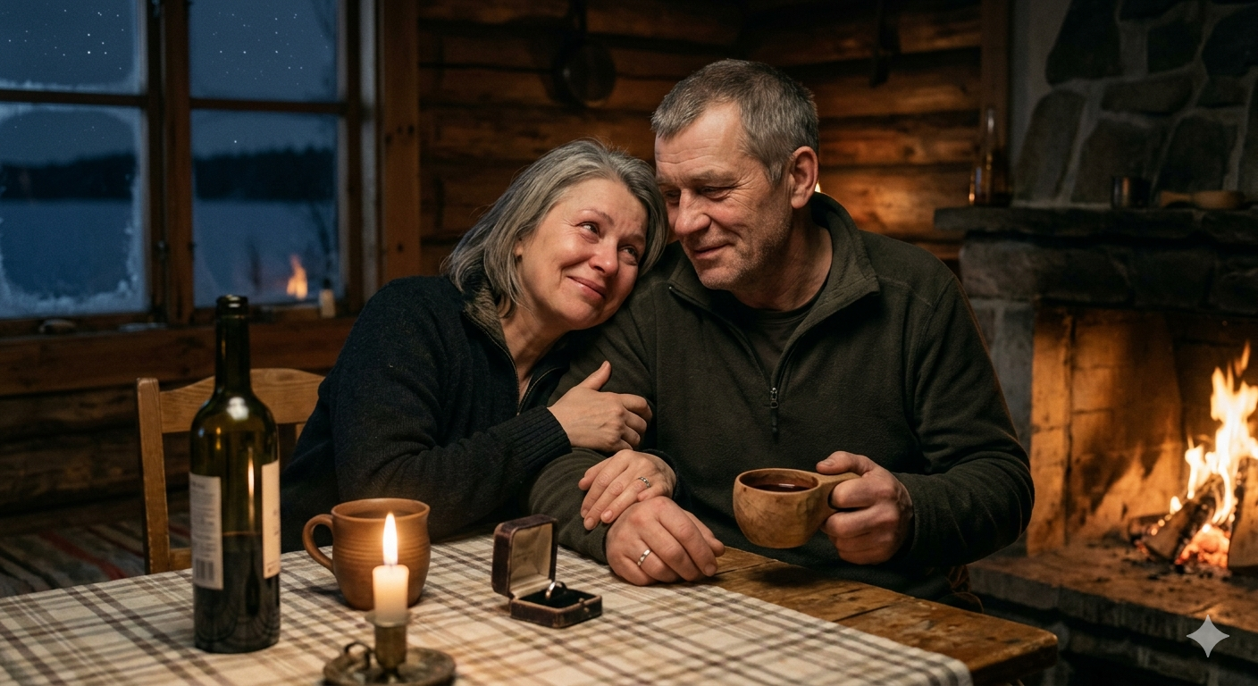Олег сел рядом. Достал из кармана коробочку. Потрепанную, мягкую, явно долго носил с собой. Катя открыла. Колечко лежало на выцветшем бархате. Простое, с маленьким камушком. Оно светилось в свете камина, будто само по себе.