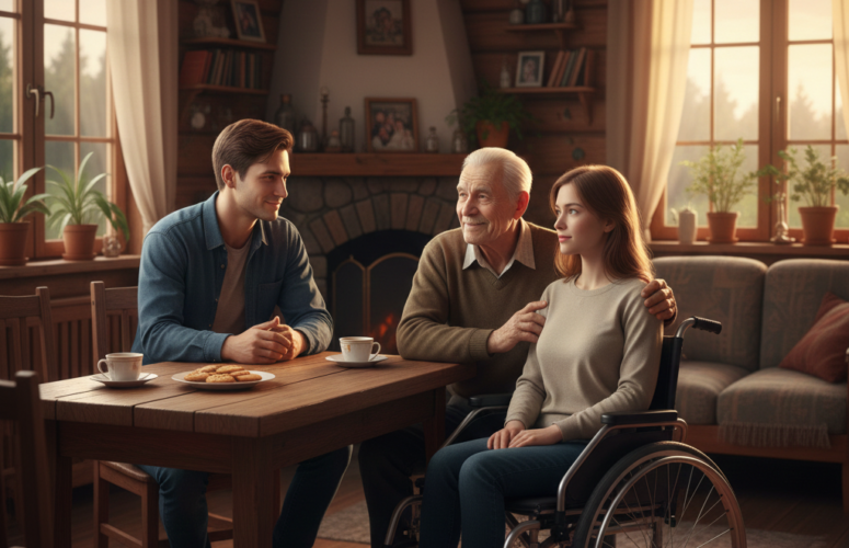 Поздний вечер в квартире на кухне. За столом сидят