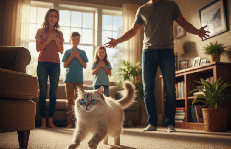 Кошка упала на газон, замерев на мгновение.
