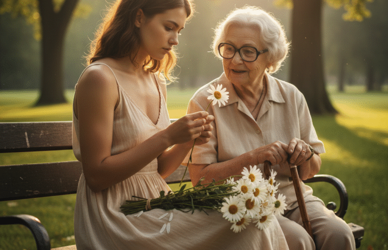 Девушка сидела в парке на скамейке и гадала на ромашке.