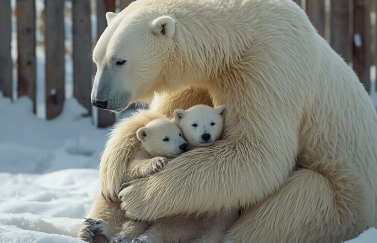 Небольшая белая медведица прикрывала собой двух маленьких медвежат.