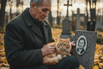 Кошка сидела на гранитной плите прямо над фотографией