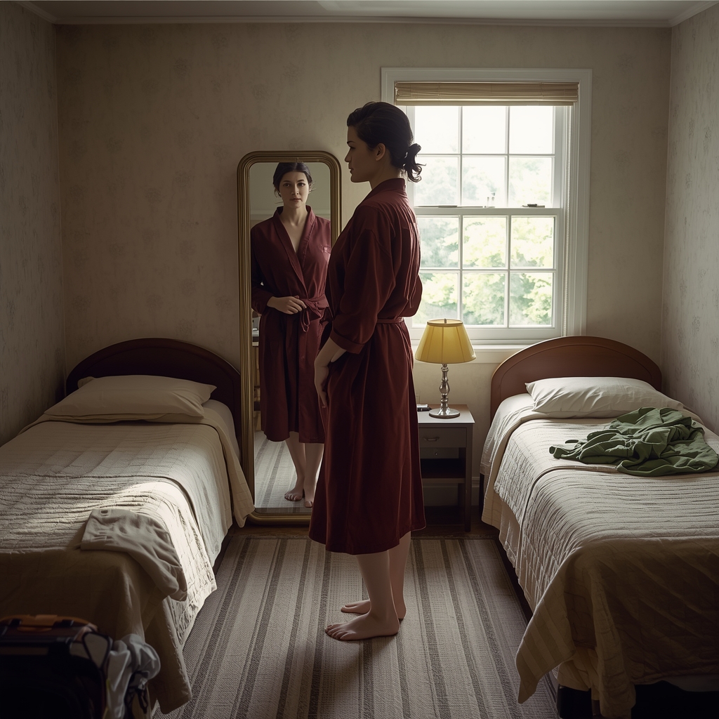 Я стояла посреди номера. В руках — тот самый бордовый халат, только что из чемодана. Плюшевый, тяжёлый, с ярлычком, который я не успела срезать.