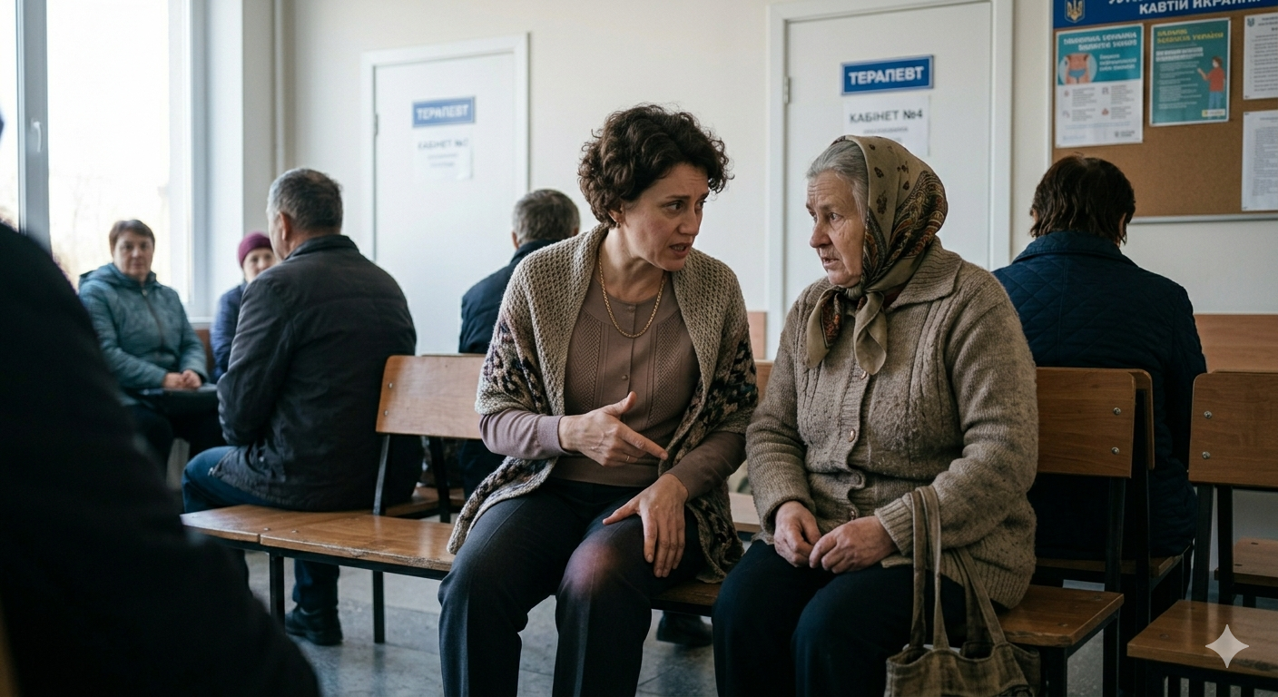 Как и положено по классике жанра, бабульки ходят к врачам не столько ради лечения, сколько ради общения. Эта пожилая дама встретила свою знакомую, и вскоре они уже оживлённо беседовали.