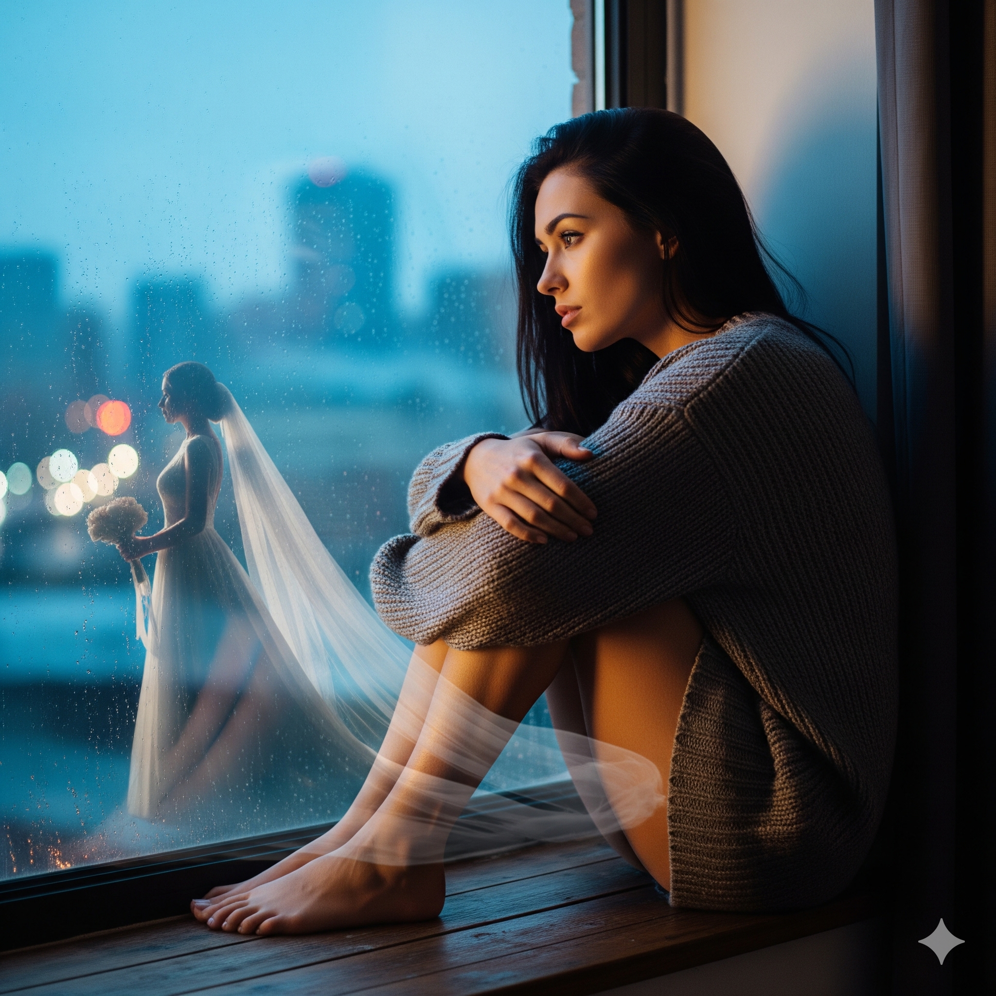 Я сижу на подоконнике, обхватив колени, и смотрю на город за окном. Мысли кружатся, как осенние листья на ветру.