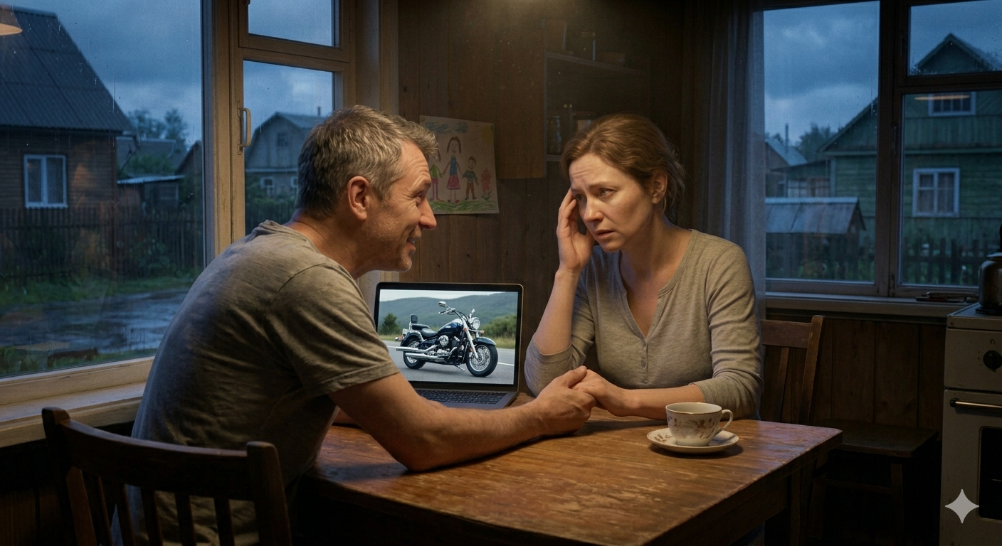 — Ваня, ты что, с ума сошёл?! — я замерла на пороге кухни, глядя, как муж с восторгом разглядывает фото мотоцикла на экране ноутбука.