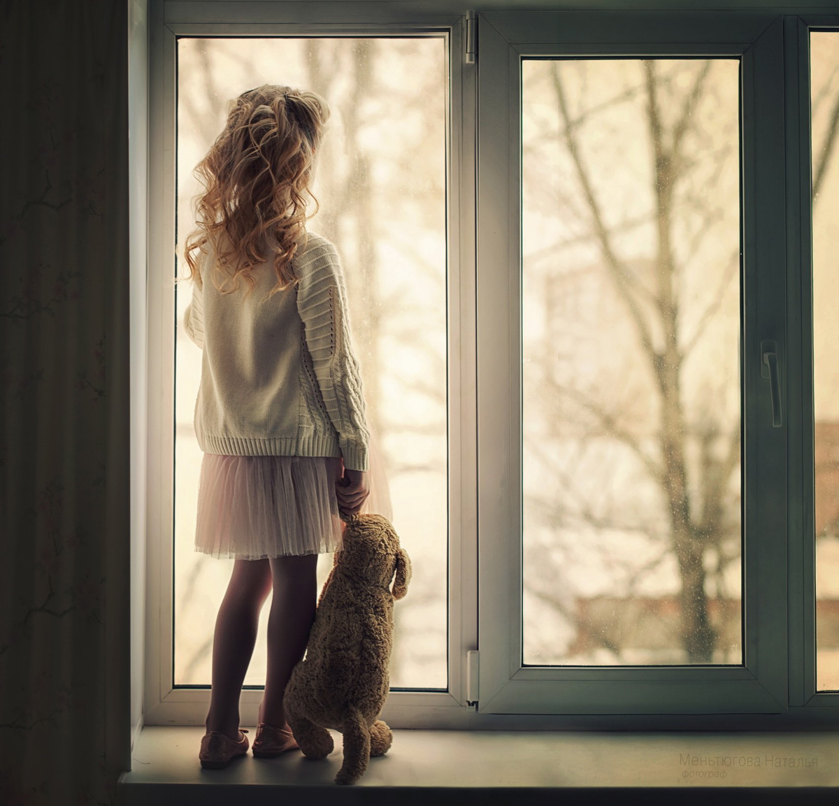 Девочка маленькая, она не достаёт до подоконника, прижимая к себе это чудо из голубого плюша, девочка становится на цыпочки и старается посмотреть в окно, там должна прийти мама.