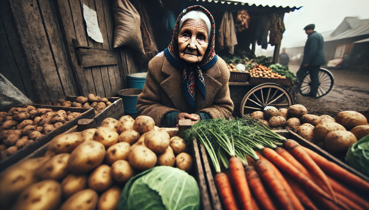 Возле одного из прилавков стояла пожилая женщина. На старом клеёнчатом покрывале аккуратно разложены помидоры, картошка и пучки свежей зелени. Всё выглядело так, будто бабушка дома каждую веточку вытерла и выложила с любовью.